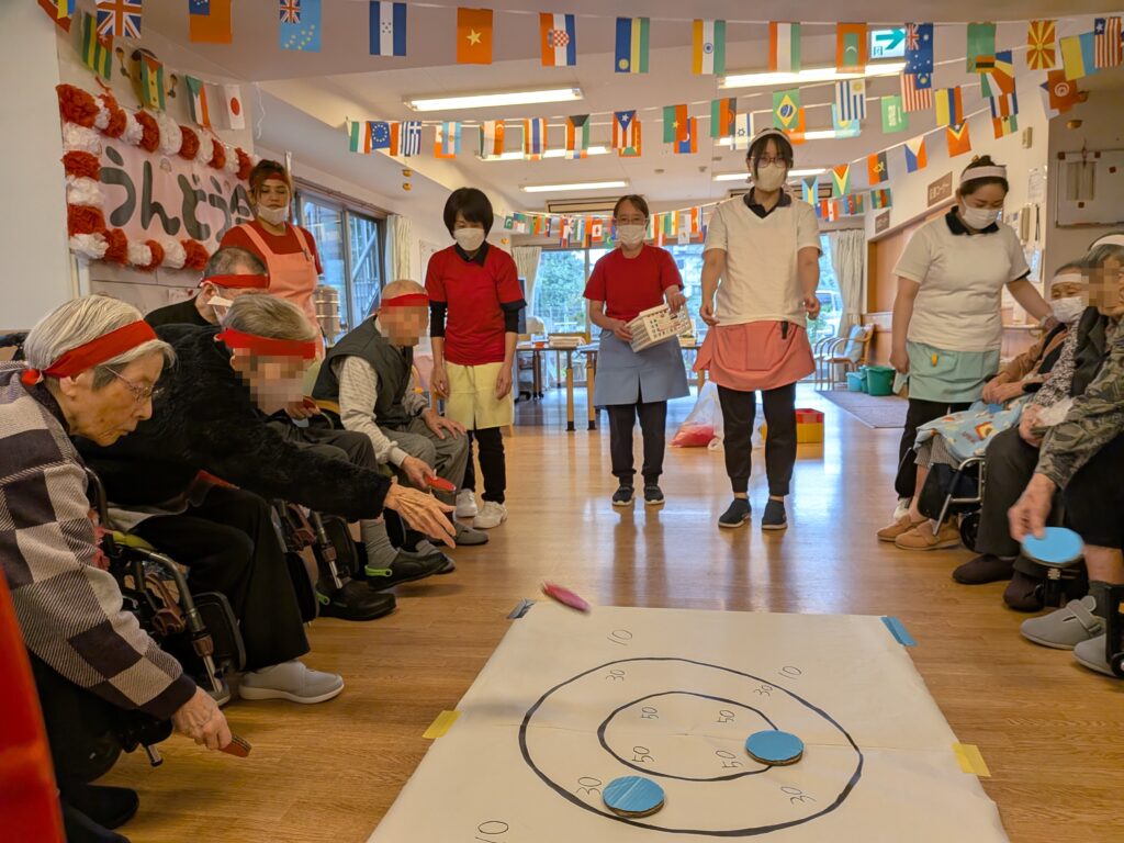 真剣な眼差しで慎重にカゴに向かって上手に玉入れ